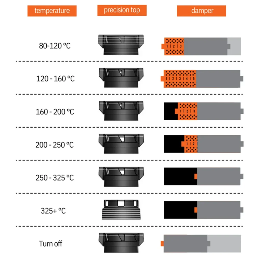 Het is niet zo moeilijk om een constante hoge temperatuur van bijvoorbeeld 250 graden Celsius of een lage temperatuur van 80-90 graden Celsius te bereiken. Ook kun je tot zelfs 12 uur lang zonder nieuwe houtskool toe te voegen, een constante lage temperatuur realiseren.